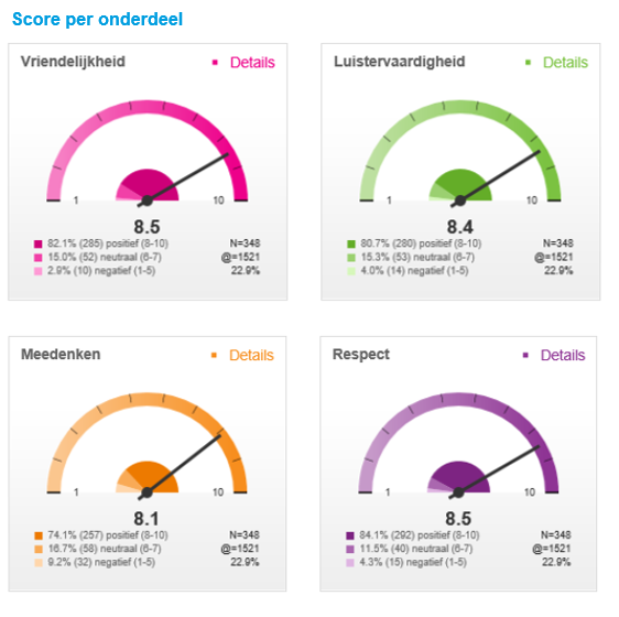 Onze dienstverlening wordt op vier onderdelen gemeten: vriendelijkheid, luistervaardigheid, meedenken en respect. Op al deze onderdelen scoren we boven de 8. Ook worden ruim 84% van de telefonische klantvragen direct beantwoord. We merken dat we de klant steeds vaker direct een antwoord op de vraag kunnen geven, zonder te moeten doorverbinden.