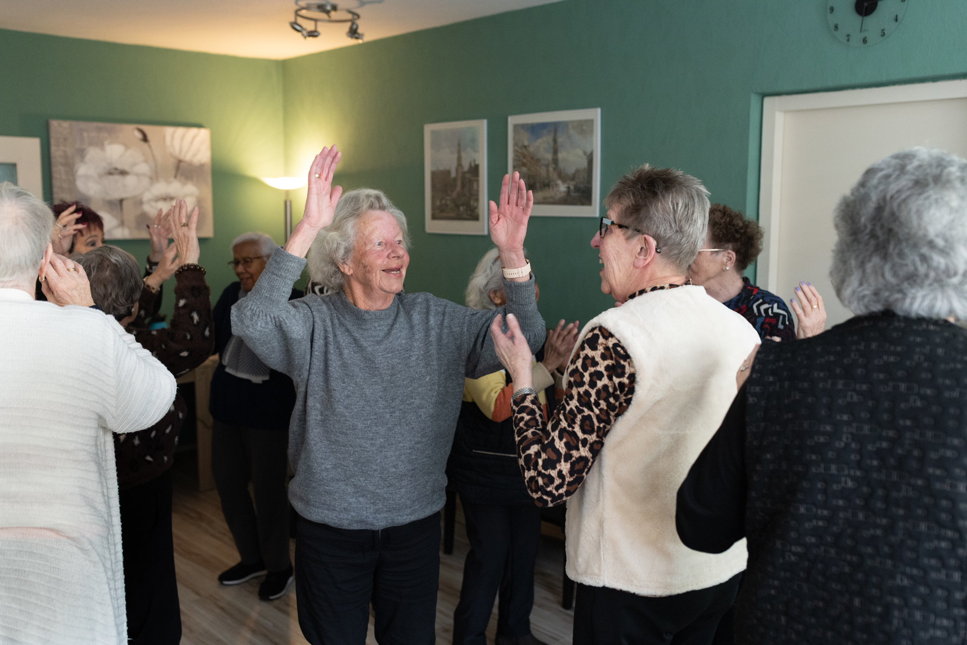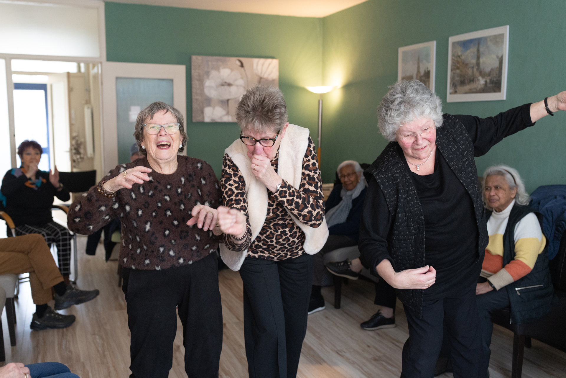 “Als we salsa dansen (op onze stoel!) dan maak ik van lege flesjes gevuld met knopen sambaballen waarmee je op het ritme kunt schudden. Natuurlijk gaat er wel eens wat mis; dan lachen we ons suf! Het is wat mij betreft vooral een gezellig sociaal gebeuren. Dat blijkt ook wel, want de eerste twintig deelnemers die zich twee jaar geleden meldden, zijn er nog steeds, ze zijn heel trouw. Je ziet het plezier dat ze er samen aan beleven! Er zit een mevrouw tussen met beginnende Parkinson; haar huisarts zei: zo lang je het kunt, gewoon doen!”