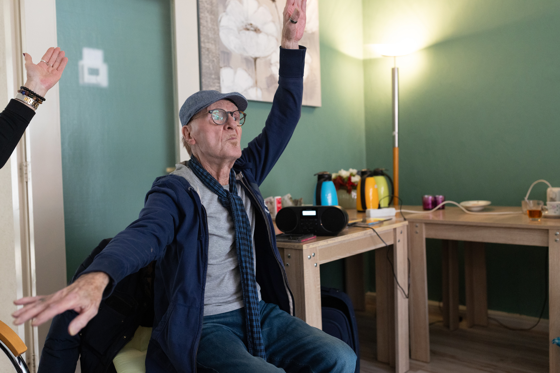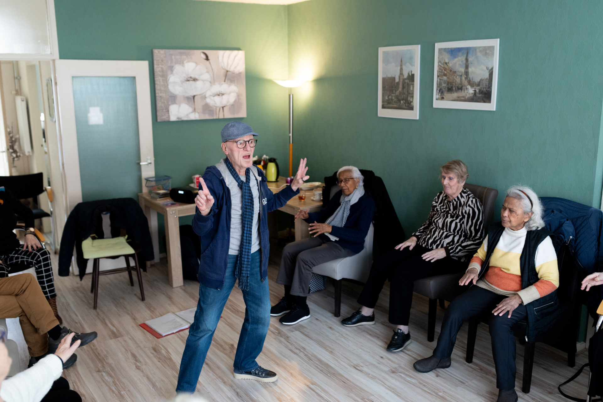 Voor de vaste donderdagmiddag met ‘bewegen op muziek’ is hij benaderd door Toos Alssema, de beheerder van de Huiskamer in de Polluxflat. Daar bleef het na de coronaperiode wat stil. Joop ging zich oriënteren op Google wat hij voor lessen kon geven. Een spagaat of pirouette zit er niet meer in bij de deelnemers (de oudste danseres is 91), dus het werd ‘ballet op een stoel’. Joop vertelt: “Het moet natuurlijk wel een beetje passen bij onze leeftijd. Ik zag een keer in een zorginstelling zo’n dansmiddag voor ouderen, onder leiding van een 20-jarig hip meisje. Als muziek koos ze keiharde techno – de bewegingen die ze voordeed waren een soort zware gymnastiekoefeningen. Bam! Bam! Goed bedoeld, maar dat leek me niet de bedoeling hier. Ik draai Abba of Frans Bauer. Die liedjes zijn heel herkenbaar, zodat ze ook nog lekker kunnen meezingen om de stembanden even te trainen. Ik ben geen personal trainer in een sportschool, ik ben choreograaf, dus het moet er ook nog een beetje leuk uit zien, vind ik.” Tijdens ‘Dancing Queen’ van Abba moet Joop toch even streng zijn: “Veel hoger die handen, je beeldt een kroon uit, geen paar oorwarmers!”
