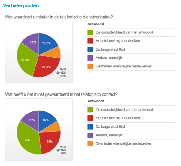 Onze dienstverlening wordt op vier onderdelen gemeten: vriendelijkheid, luistervaardigheid, meedenken en respect. Op al deze onderdelen scoren we boven de 8. Ook worden ruim 84% van de telefonische klantvragen direct beantwoord. We merken dat we de klant steeds vaker direct een antwoord op de vraag kunnen geven, zonder te moeten doorverbinden.
